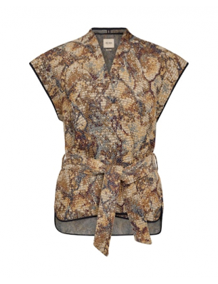 Mos Mosh gilet imprimé...Le gilet MMOz Wired Vest de Mos Mosh est un gilet structuré, magnifiquement tissé, avec un subtil motif chiné dans des tons terreux et une encolure...