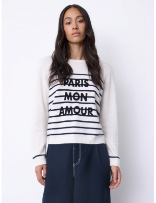 Not Shy Pull rayé en laine...Pull Not Shy pour femme, col rond, manches longues avec Rayures horizontales Ecriture imprimée “PARIS MON AMOUR”