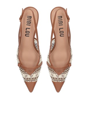 Escarpins à brides arrière de Bibi Lou. Ils sont fabriqués à partir de cuir camel et de résille brodé et présentent des bouts pointus et des talons fin de 60 mm.