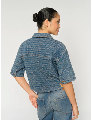 Blouson MosMosh en jeans texturé. à col chemise avec manches courtes et fermeture par boutons sur le devant. Deux poches boutonnées sur la poitrine. Coupe courte avec taille ajustable par boutons.