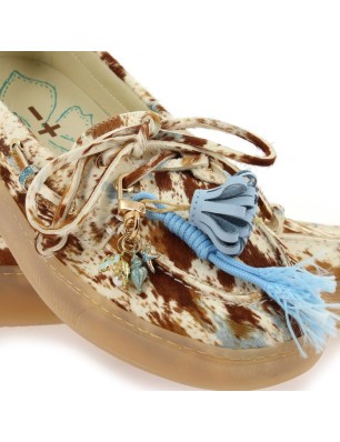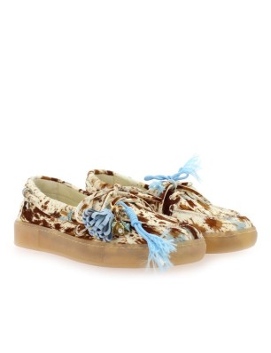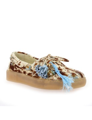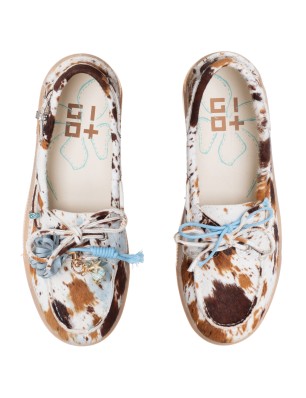 Mocassins Gio+ à imprimé animal sur fond naturel, parsemés de taches camel, marron et bleues. Semelle en caoutchouc. Détail de lacets sur le pourtour et nœud décoratif sur le dessus. Conçus et fabriqués en Italie.
