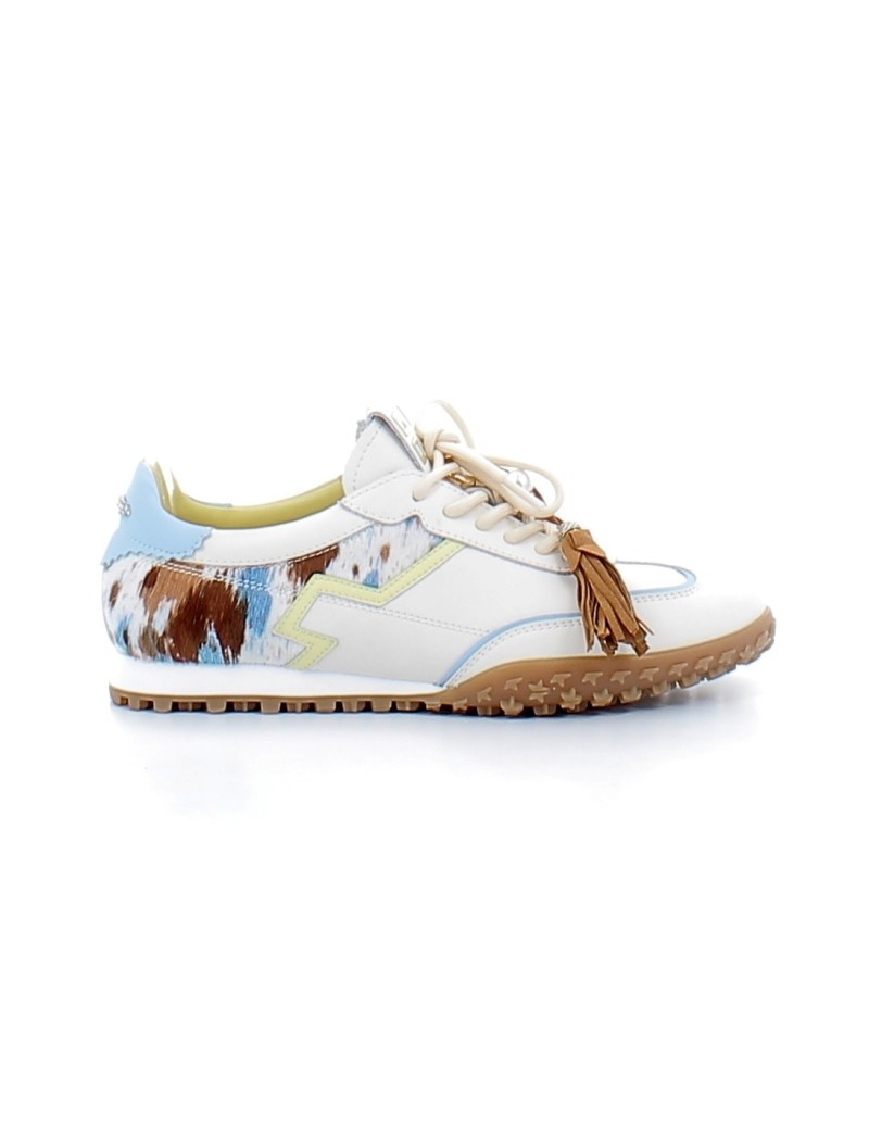 Tennis sport chic dessus cuir blanc, poil motifs vache marron, blanc et bleu avec accessoires amovible. Elles sont confectionnées en Italie par Giopiu.