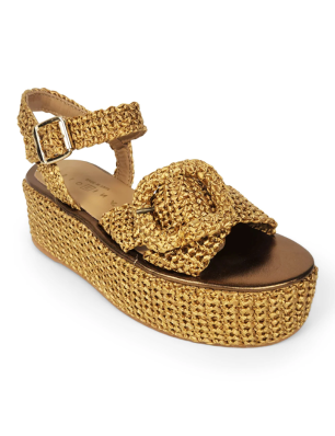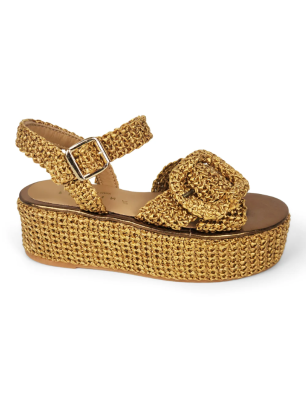 Sandale à plateforme en raphia mordoré signée Fiorina. Elle est customisée par une jolie boucle.. Semelle intérieure en cuir, semelle extérieure en caoutchouc beige antidérapant. Conçus pour allier style et confort, ces sandales offrent un maintien optimal grâce à leur fabrication soignée et leur coupe élégante.
