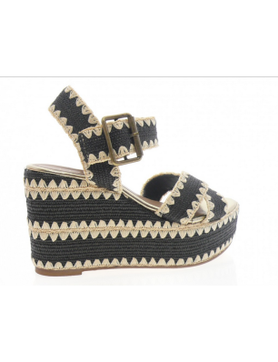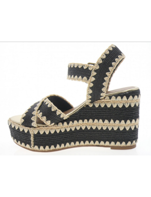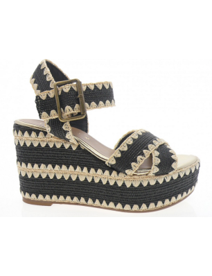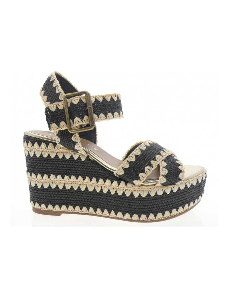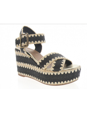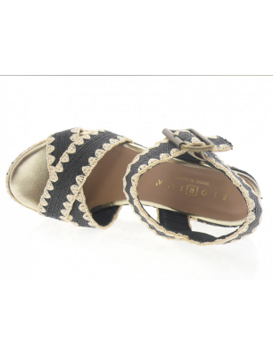 Le modèle à talon compensé Fiorina captive par son élégance sculpturale : Ses brides croisées a l'avant en raphia beige et noir maintiendront votre pied. La bride autour de la cheville s'ajuste avec une jolie boucle en métal bronze. hauteur 10 cm cambrure 5 cm