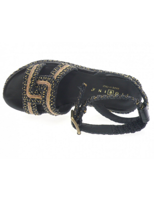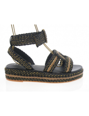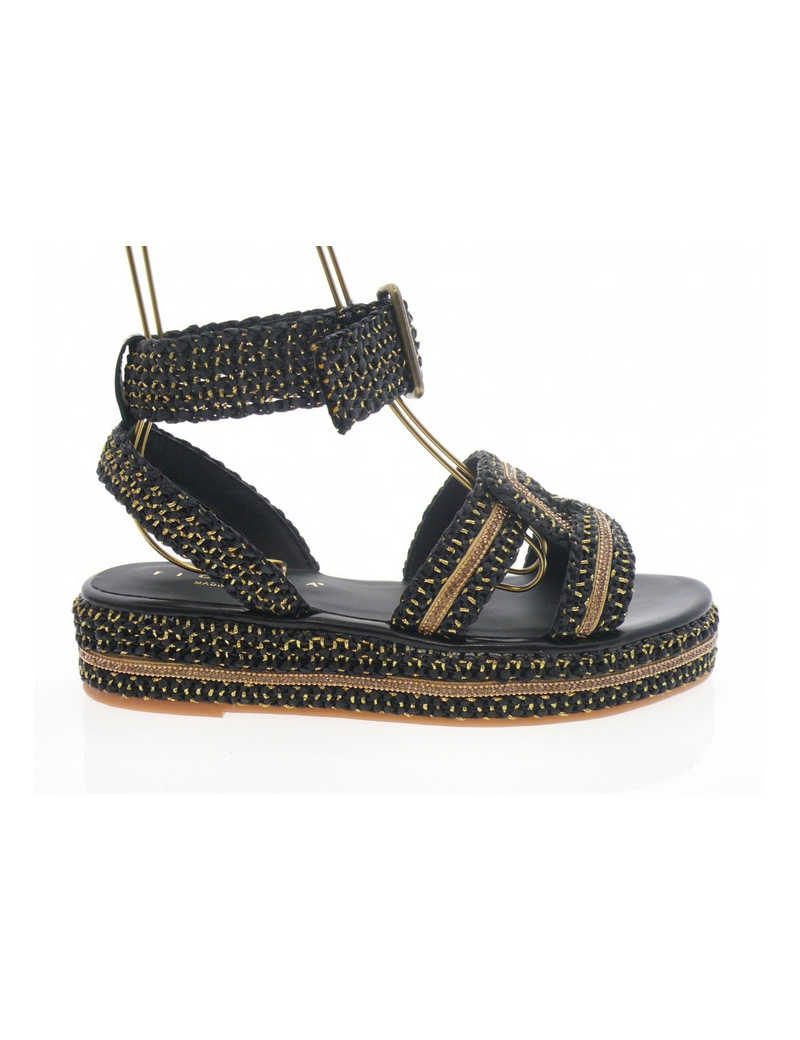 Sandales Fiorina en raphia couleur noir et or à brides entrecroisées Elles sont montées sur une plateforme 4 cm. Finitions: détails fines chaines dorées et strass sur la sandales et sur la plateforme.