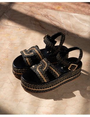 Fiorina sandales compensées en raphia noir et doré