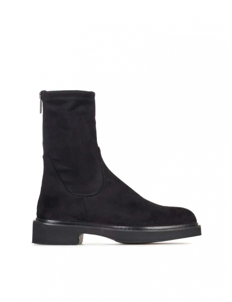 Bottines Evaluna en daim stretch noir avec fermeture éclair à l'arrière. Élégante et polyvalente, elle est parfaite pour des tenues décontractées chics et raffinées, de jour comme de soir.