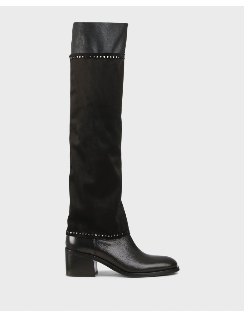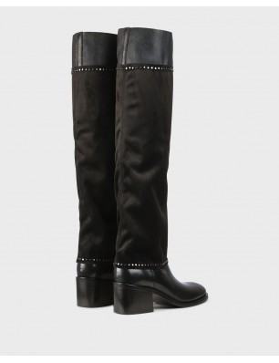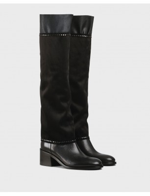 Fru.it vous présente les bottes stretch avec guêtres en suédé. c’est le modèle qu'il vous faut!! ces beautés sont conçues en matière souple noire et reposent sur un talon de 6 cm.