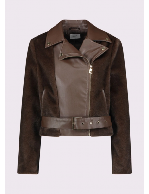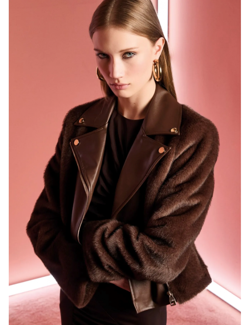 Cette veste motarde, issue de la collection hiver 2025 de Gaudi, est réalisée à partir de cuir et vison synthétique marron. Elle est agrémentée d'une fermeture zippée dorée et d'une ceinture avec boucle.