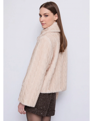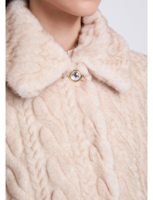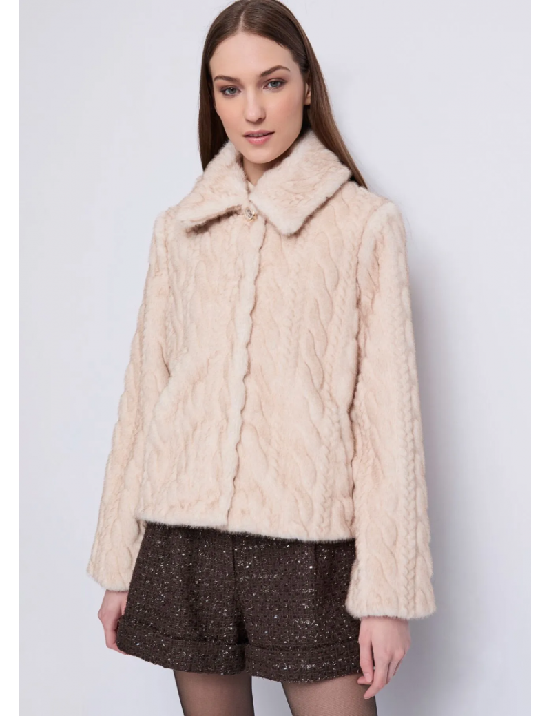 Optez pour la douce veste en fausse fourrure signée GAUDI, avec sa maille torsadée et son col à revers. Chaude et enveloppante, elle crée un look raffiné et intemporel. Ajoutez des bottes motardes pour une touche rock et audacieuse.