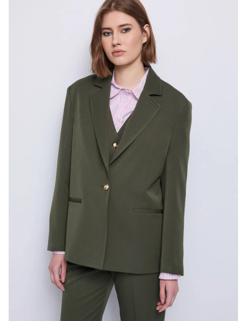 Optez pour ce blazer vert olive signé Gaudi droit en viscose mélangée extensible, doté de poches passepoilées et d'un bouton doré. Sa coupe décontractée lui confère une élégance intemporelle. Ce modèle s'associe parfaitement au gilet et au pantalon assortis pour un look chic et irrésistible. Des bottines à talons hauts complètent la tenue.