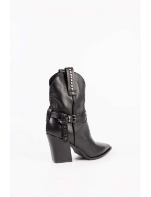 Bottine Mimmu en cuir noir d'inspiration western. Hauteur du talon 8 cm
