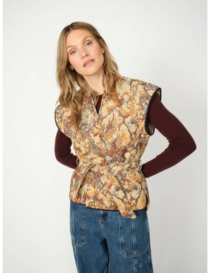 Rehaussez votre tenue avec ce gilet original de Mos Mosh, orné d'un motif audacieux. Conçu avec une ceinture assortie pour souligner la taille, il crée une silhouette flatteuse. Portez-le sur un chemisier délicat et associez-le à une jupe fluide ou un jean large pour un look chic et polyvalent.