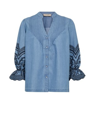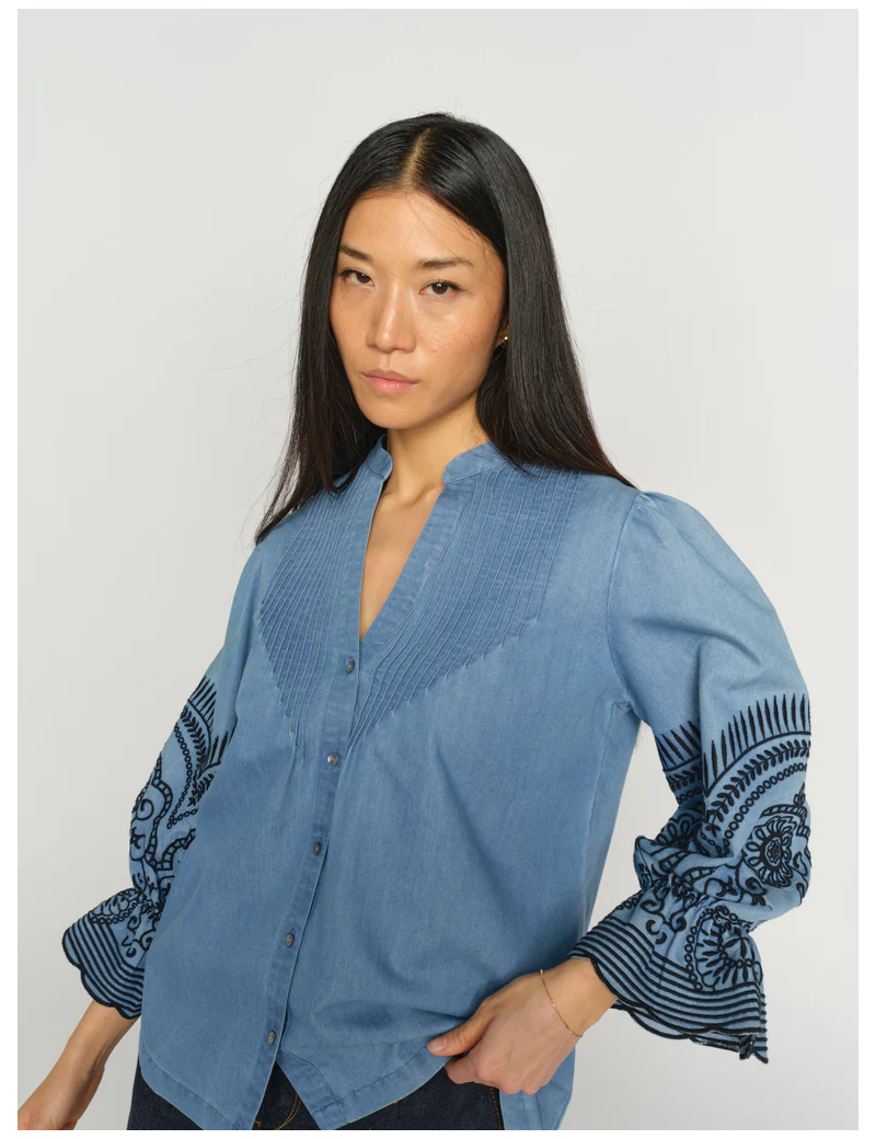 Blouse en coton denim avec broderies noires signée MosMosh