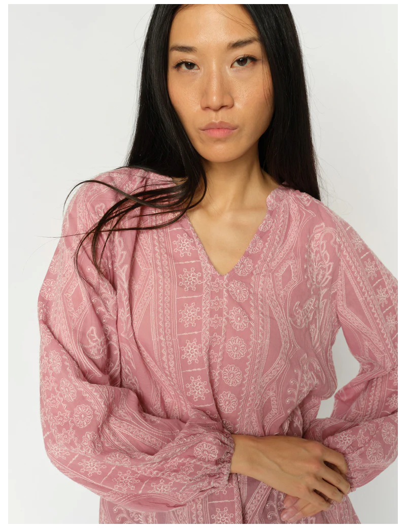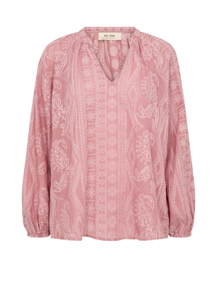 Blouse original de MosMosh ornée de broderies ton sur ton délicates qui apportent profondeur et texture à sa douce base en coton. Conçu avec un décolleté en V flatteur et une coupe décontractée, elle est agrémentée de poignets élastiqués pour un volume subtil. Parfait avec un jean ou un tailleur pour une allure bohème chic.