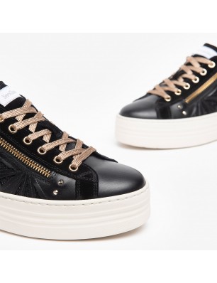 Nero Giardini vous propose ces baskets réalisées cuir noir. Montées sur une semelle épaisse en caoutchouc blanc. Elles sont dotées d'une fermeture zippée sur le côté pour un enfilage rapide et facile! Agrémentées d'empiècements pailletés noir et de jolis lacets dorés. La semelle intérieure est conçue avec une mousse spéciale qui absorbe l'humidité dans la chaussure fournissant une sensation bien-être. Baskets entièrement confectionnées en Italie. es sneakers se porteront volontiers avec une robe pour opérer un savant décalage de styles.