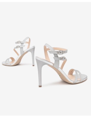 Sandales Nero Giardini réalisées en Italie à partir de textile pailleté argenté doublé cuir. Avec leur allure intemporelle, ces sandales habillées à brides fine se feront une place de choix dans votre dressing shoes. Elles reposent sur des talons fin de 9 cm.
