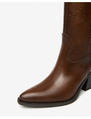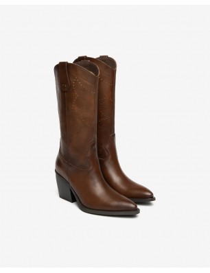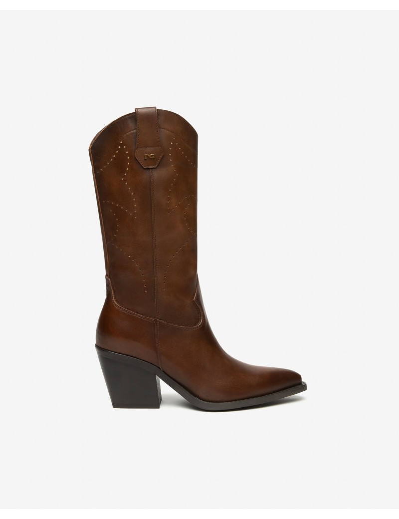 Ces bottes de Nero Giardini sont empreintes d'un esprit résolument western. Elles sont réalisées à partir d’un cuir lisse marron auquel sont décorés de motifs découpés au laser. Leur talon cubain offre une hauteur de 75 mm.