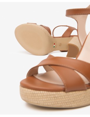 Sandales Nero Giardini a brides cheville en cuir camel. Elles sont montées sur un talon bloc de 11 cm et d'un plateau de 2 cm.