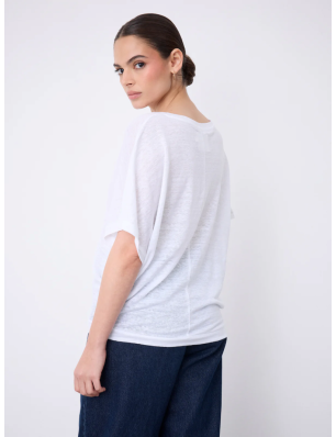 Le t-shirt Sophia de Not Shy est 100% en lin blanc avec une coupe oversize, un col V et des manches courtes avec un effet chauve-souris.